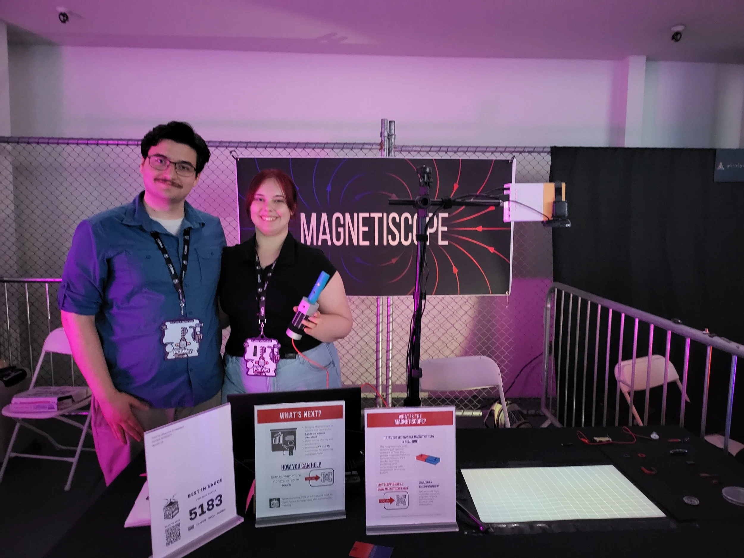 Joseph Broadway and Tessa Brazda at the public debut of the Magnetiscope during Open Sauce 2025. The device revealed the hidden geometry of magnetic fields for attendees in real time.