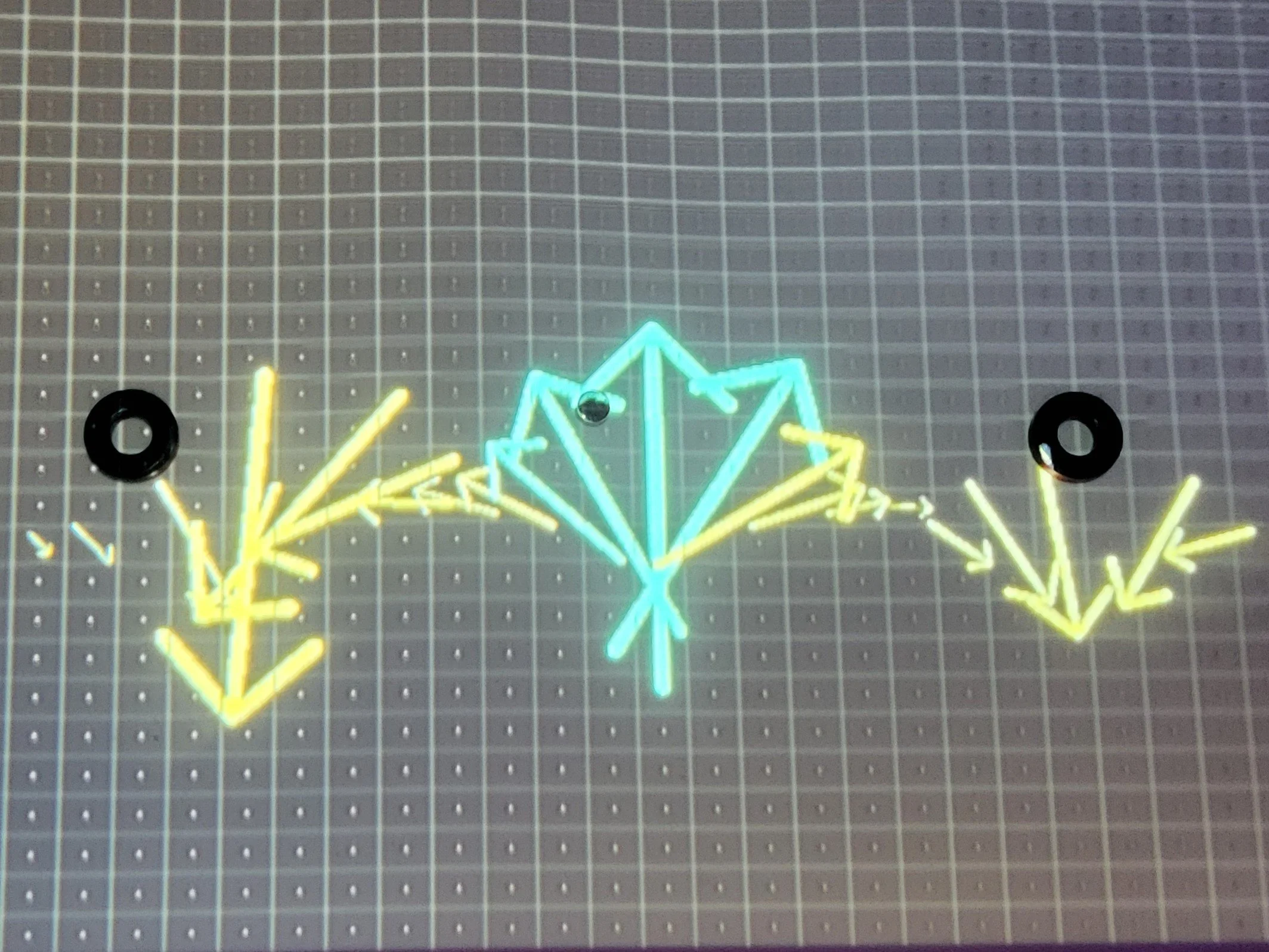 A complex vector field showing magnetic interactions between two ring magnets and a neodymium magnet. The Magnetiscope visualizes the push and pull of magnetic forces in real time.